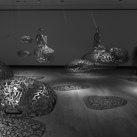 On view in the Madison Museum of Contemporary Art's State Street Gallery in 2017, Jaume Plensa: Talking Continents was an enveloping installation of suspended steel forms that appeared to transcend their own physical weight and volume, and instead convey lightness, translucence, and fluidity. This floating body of work transformed the gallery into a space for contemplation.